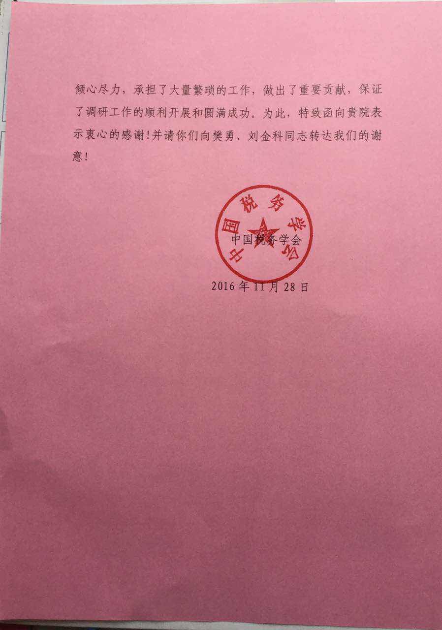 日前,中国税务学会致信感谢永利yl23455对学会工作的大力支持,特别感谢樊勇、刘金科两位教师参与金融业营改增税负问题专项课题研究所做出的努力与贡献。学会对两位教师全程参与课题调研工作,克服困难,不辞辛苦、献计献策,承担了大量繁琐的工作,倾心尽力并做出重要贡献,给予了高度肯定。