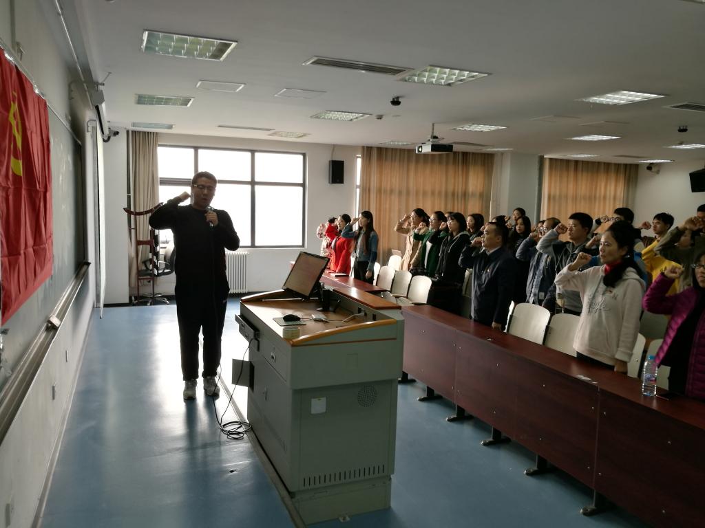 此次活动分为奏唱国歌,重温入党誓词和书记第一课三个环节。在奏唱国歌和重温入党誓词之后,樊勇书记为2017级全体研究生党员上了生动的一课。