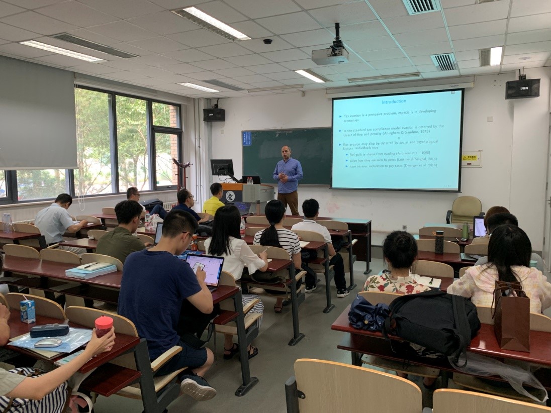 本次短期课程包括四个专题:《Pecuniary and Non-Pecuniary Motivations for Tax Compliance:Evidence from Pakistan》、《Information, Asymmetric Incentives, Or Withholding? Understanding the Self-Enforcement of Value-Added Tax》、《Does Cutting the Tax Rate to Zero Induce Behavior Different from Other Tax Cuts? Evidence from Pakistan》、《Taxes, Infromality and income shifting:Evidence from a recent Pakistani tax reform》。专题主要围绕征管和逃税展开,包括:(1)纳税信息披露对个人税收偷逃行为的影响(2)增值税改革扩围过程中企业的税收偷逃行为(3)税率变化过程中,个人收入瞒报行为的变化。(4)税率变化过程中,企业对自身组织形式以及进入退出策略的选择。同时,Mazhar 教授还就税收理论、巴基斯坦与中国税收政策的异同等问题与公司教师进行了深入讨论。