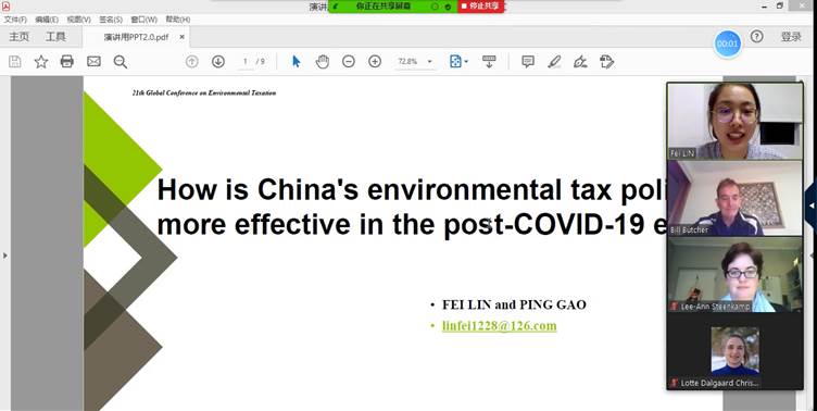 林菲同学在分论坛上发表了题为“Howis China's environmental tax policy more effective in the post-COVID-19 era?”的演讲。林菲同学介绍了新冠肺炎疫情对我国经济、环境和社会等方面的影响,讨论了疫情期间我国环境税收政策对税收优惠和征管方面做出的改进和创新,重点探讨了我国在“无接触式”办税新形式和危险废物的税收优惠政策等方面的进展和有益经验,并指出在后疫情时代,中国税负上调空间可能受限,环境税收政策实施应更注重运用现代税收征管方式,实现征管效率的提高,进一步完善危险废物的环境税收政策以及医疗废物资源综合利用政策等。这一主题引起了与会者的广泛关注,来自南非、意大利、西班牙等国的学者积极围绕林菲同学的发言展开讨论,并深入交换了学术观点。在全球疫情仍然严峻的当下,公司师生紧扣全球新冠疫情严峻背景,把握疫情期间我国环境税收政策实际,重点介绍并探讨了后疫情时代我国环境税收的有效性问题,这有助于增进其他国家对我国环境税收政策的了解,也有助于公司师生了解国际环境税收研究的前沿方向。