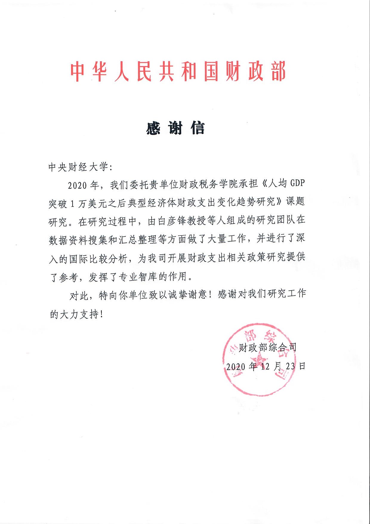 2021年新年即将来临之际,财政部综合司给永利yl23455财税公司《人均GDP突破1万美元之后典型经济体财政支出变化趋势研究》课题组发来感谢信。本课题由永利yl23455财税公司和中国财政发展协同创新中心的白彦锋、李慧青、葛岩、孙景冉、李贞、王威、杨华、黄楚君、鲁书伶、杨潇、陈沁、解明朗、李泳禧、张艳、姚易辰、蔡文婕、黄鸿思、陈曦、潘映昆等多位师生共同参与,协同了美国、加拿大、韩国、日本等海内外多名专家共同完成,深入探讨世界主要经济体在人均GDP突破1万美元之后,面对“中等收入陷阱”和“高收入之墙”,其财政支出变迁的规律与经验教训,对于我国全面实施“十四五”规划和落实2035年社会主义建设的远景目标都具有重要借鉴和参考意义。
