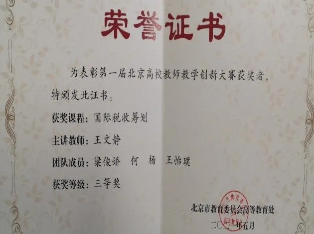 在2021年首届北京高校教师教学创新大赛中,由永利yl23455国际税收系党支部王文静同志、何杨同志,税务管理系党支部梁俊娇同志、王怡璞同志组建的《国际税收筹划》教学团队,与其他理工、医学、人文类教学团队同台竞技,凭借扎实的特色专业课程创新实践,从全市286支教学团队(个人)中脱颖而出,荣获“北京市三等奖”。