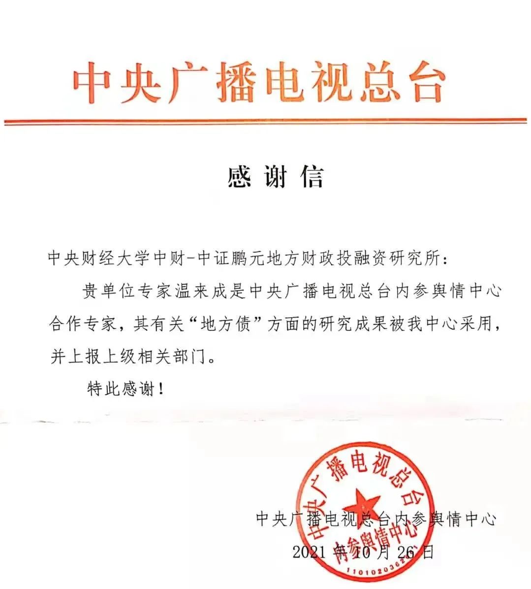 日前,中央广播电视总台内参舆情中心致函公司中财-中证鹏元地方财政投融资研究所,对温来成教授研究的成果得到该中心采纳并上报上级相关部门表示感谢。