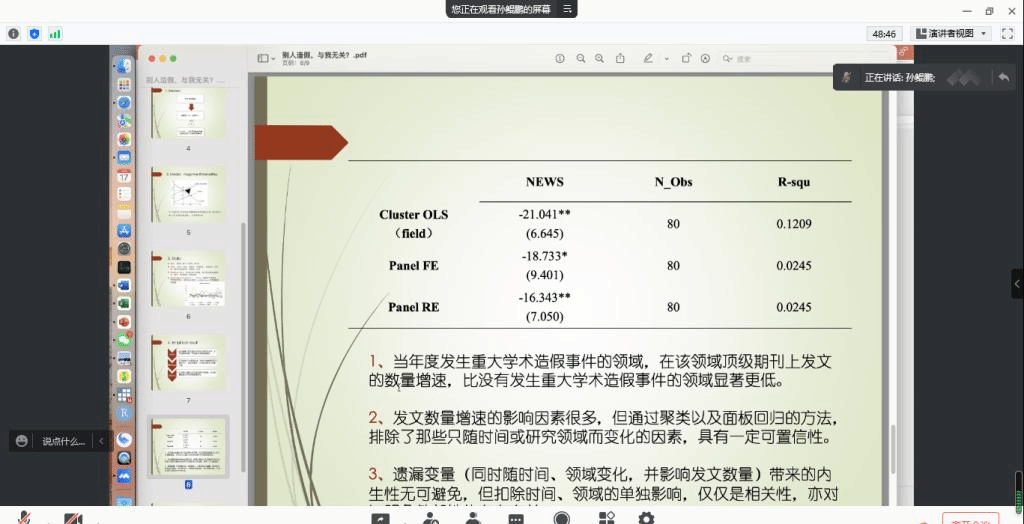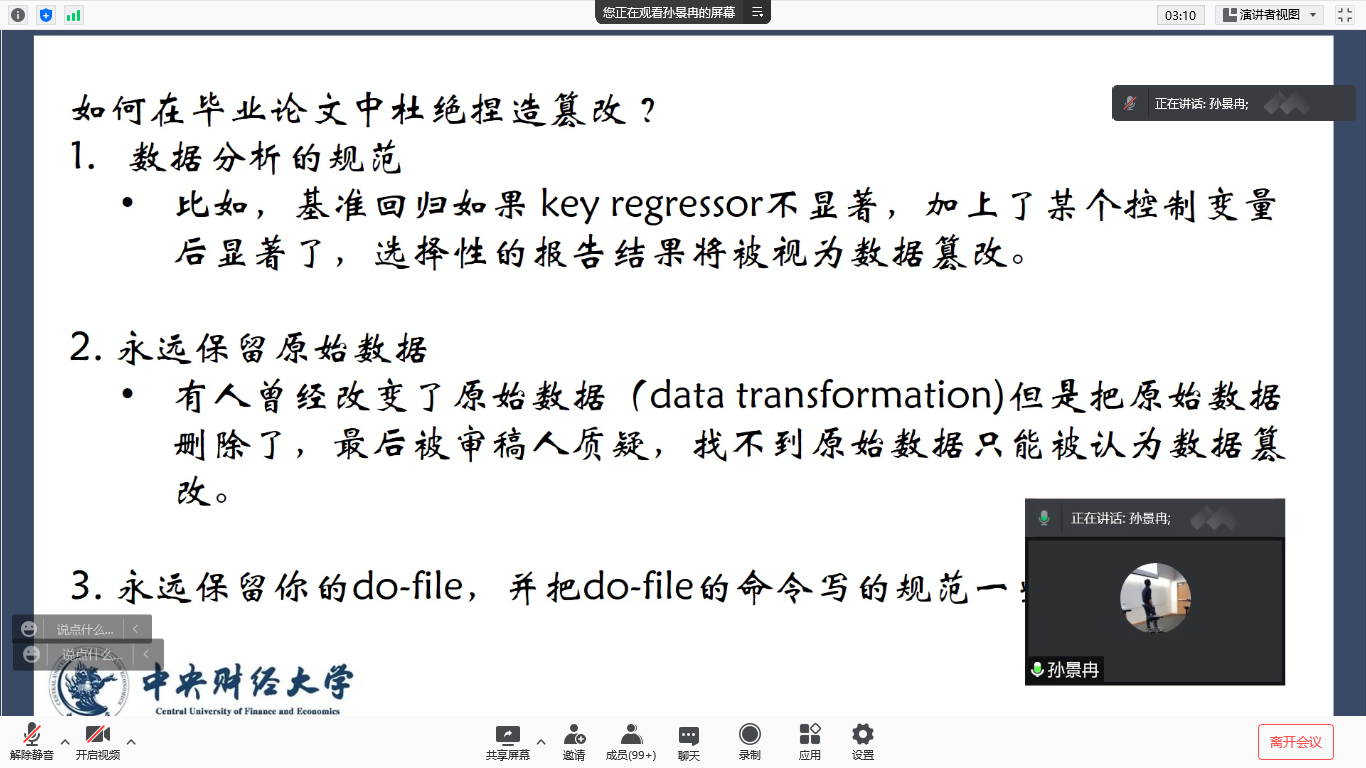 孙鲲鹏老师概述了学术不端的几种基本情况,并对论文写作、署名和发表的常见问题进行了解释,通过列举黄禹锡在干细胞研究结果中进行学术造假,最后判处有期徒刑2年的例子提醒同学们,学术不端不仅违反道德纪律,还可能涉及法律问题。他还对中国学术不端行为的负外部性进行研究,得出当年度发生重大学术造假事件的领域,在该领域顶级期刊上发文的数量增速,比没有发生重大学术造假事件的领域显著更低,因此学术不端的行为也会给该领域的学者带来集体性的负面影响。抵制学术造假,人人有责。