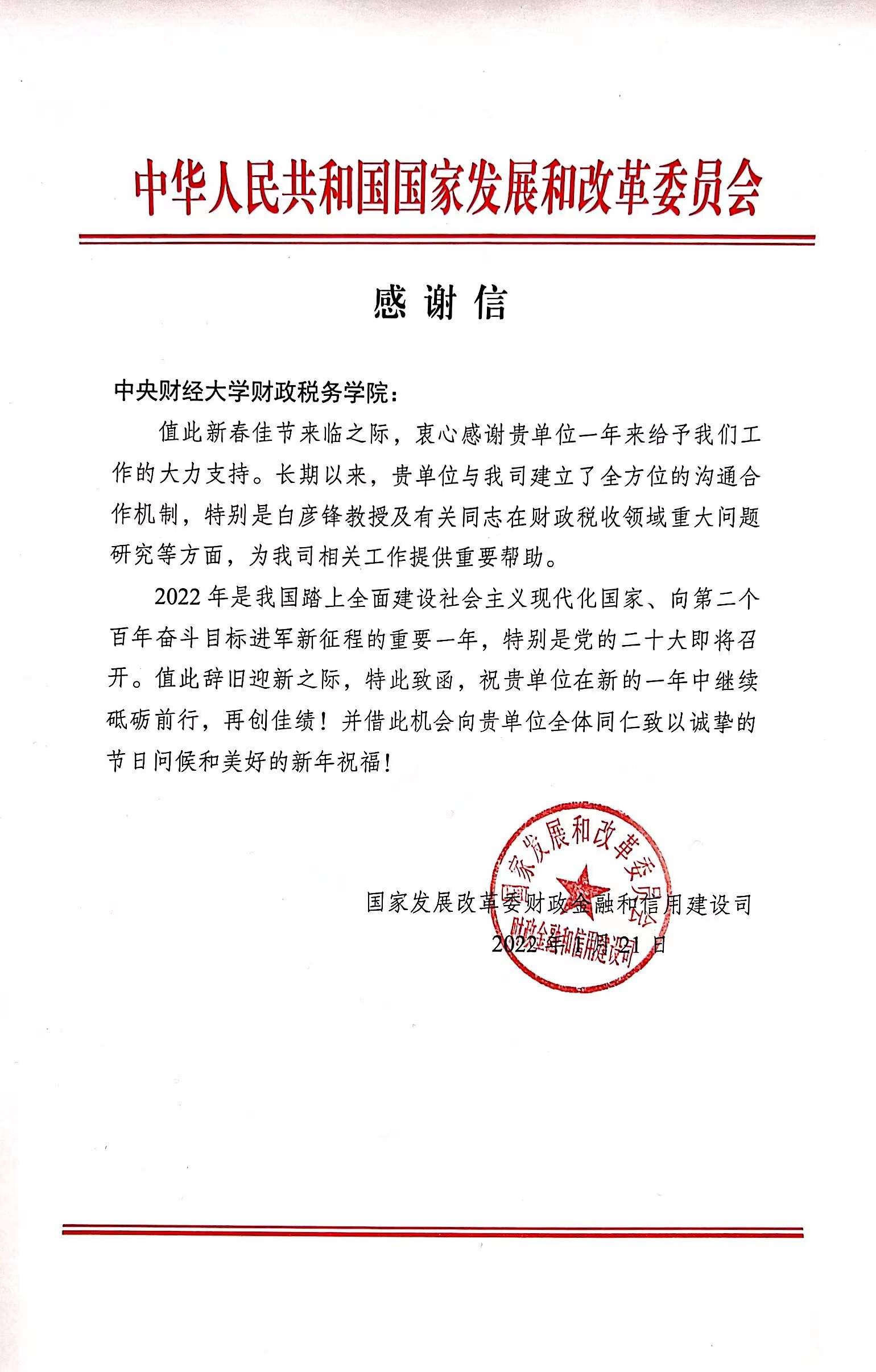 近日,国家发改委财政金融和信用建设司向公司财税公司发来感谢信。感谢信指出,财税公司与其建立了全方位的沟通合作机制,特别是白彦锋教授及有关同志在财政税收领域重大问题研究等方面,为其相关工作提供了重要帮助。长期以来,财税公司坚持以服务国家重大战略需求和政府决策为导向,立足财税学科优势与特色,充分发挥团队力量,强化战略性、全局性、前瞻性、应用性研究,更好地发挥财政专业智库作用,推动公司“双一流”建设。
