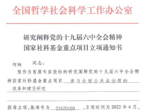 近日,永利yl23455何杨教授担任首席专家投标的研究阐释党的十九届六中全会精神国家社科基金重点项目“参与全球公共品治理的改革和建设研究”获得立项。