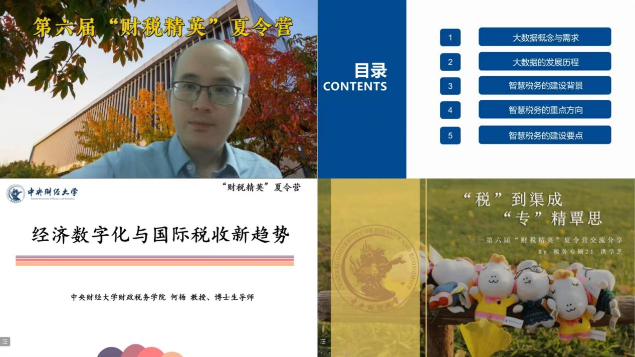 公司导向部分,中央财经⼤学永利yl23455副院⻓、博士生导师何杨教授介绍了全球化与国际税收问题的重要性、跨国公司全球架构、经济数字化与国际税收面临的挑战,并结合“双支柱”方案指出了国际税收规则新趋势,提纲挈领地呈现了国际税收领域的研究重点。杨龙见副教授则为同学们详细解读了公司税务专业硕士项目及特色。最后,第四届夏令营优秀营员洪学芝同学分享了她对税务专业的理解——“税”到渠成,“专”精覃思,并从参营经验、保研后规划和实际入学体验三个方面提供了非常值得参考的学习方法和经验。