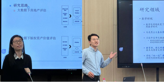 刘桓老师指出,公司教师应通过多方途径提高社会知名度,打造出一支名师团队,创造新型人才培养新高地;邵磊老师对学术研究生的培养,提出了课程融合、综合培养的建议。李燕老师表示,要充分调动教师的授课积极性,加强学教融合,不断提升课程教学质量,并提出了对资深教师的关心关爱建议;孙鲲鹏老师介绍了数字财税的研究领域,讲解了大数据与财税体制改革结合是重要的时代命题;陈思老师讲述了大数据与资产评估的关系,介绍了大数据相关技术在资产评估中的应用,如何将大数据转化为大价值;张广通老师通过自己撰写的著作,向大家分享做学术一定要能沉得下心,熬得了苦,弯得下腰,才能抬得起头,方能守住坚持,把握胜利。