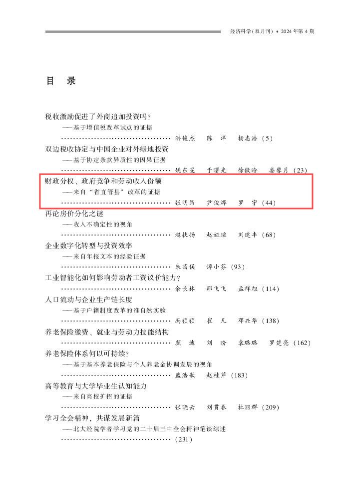 由永利yl23455张明昂副教授、尹俊烨和西南财经大学永利yl23455罗宇合作撰写的论文《财政分权、政府竞争和劳动收入份额——来自“省直管县”改革的证据》发表于中文A类期刊《经济科学》2024年第4期。以下为文章主要内容:
