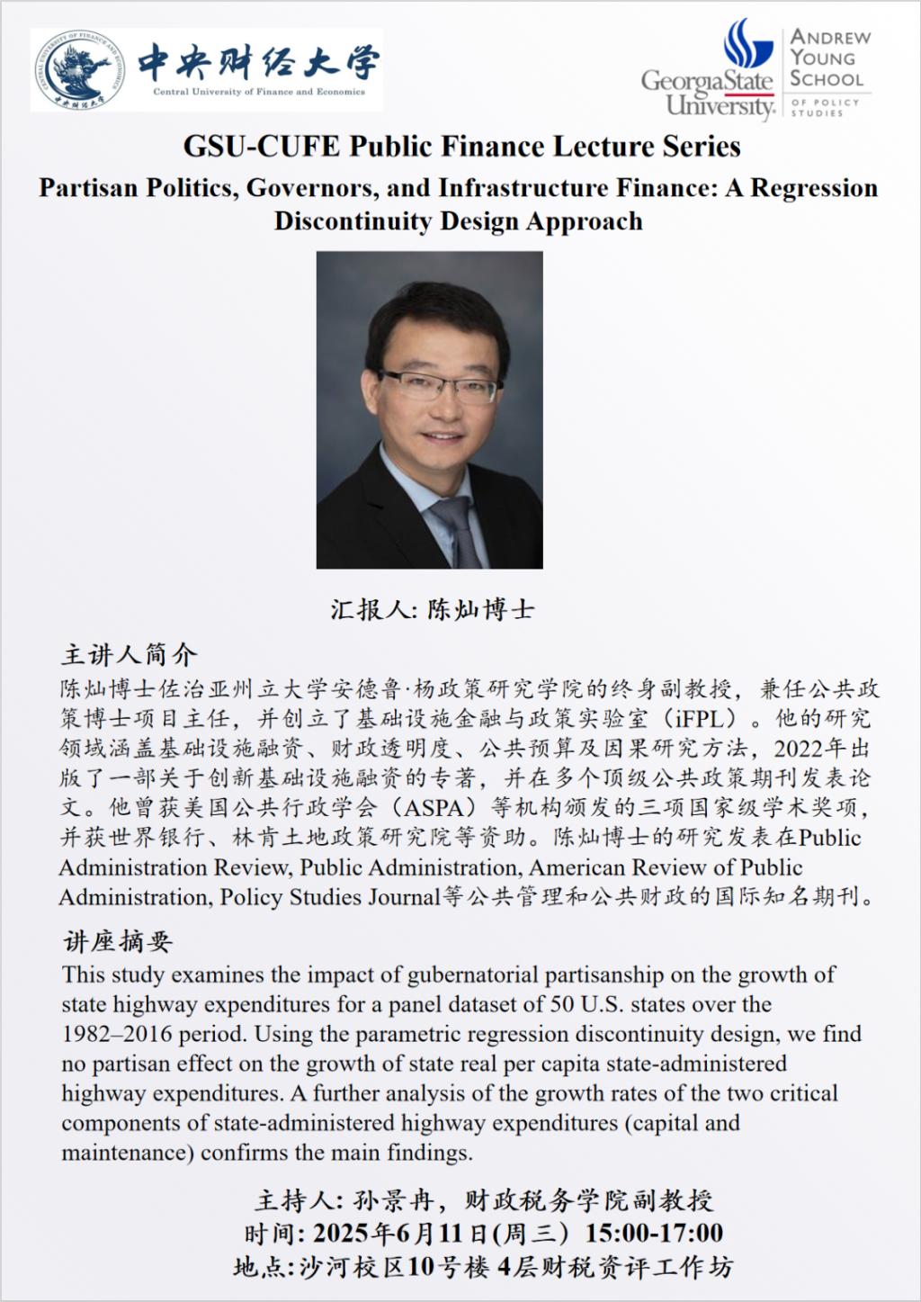 【“中财-乔治亚州立”公共财政国际学术前沿系列讲座】陈灿博士:美国基础设施投资研究