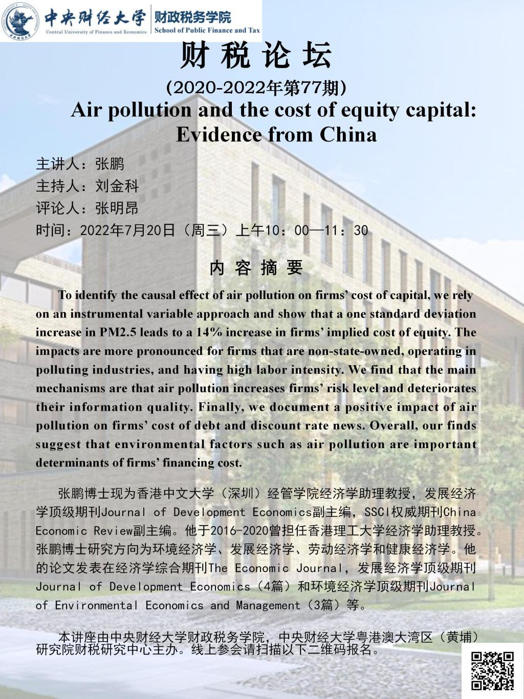 【财税论坛】Air pollution and the cost of equity capital: Evidence from China