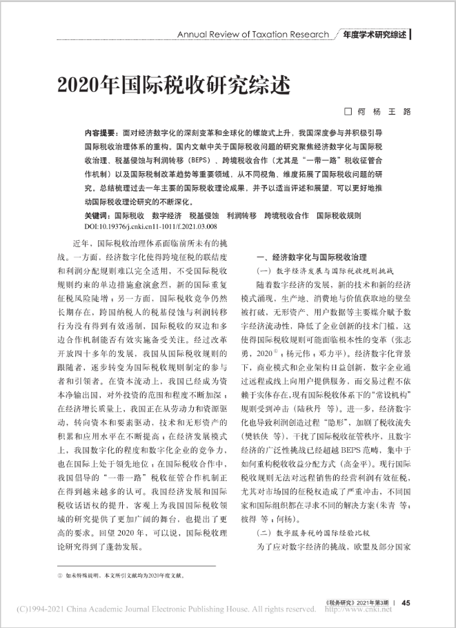 永利yl23455师生何杨、王路共同撰写的《2020年国际税收研究综述》一文发表于《税务研究》2021年第3期。王路为永利yl234552020级博士研究生。