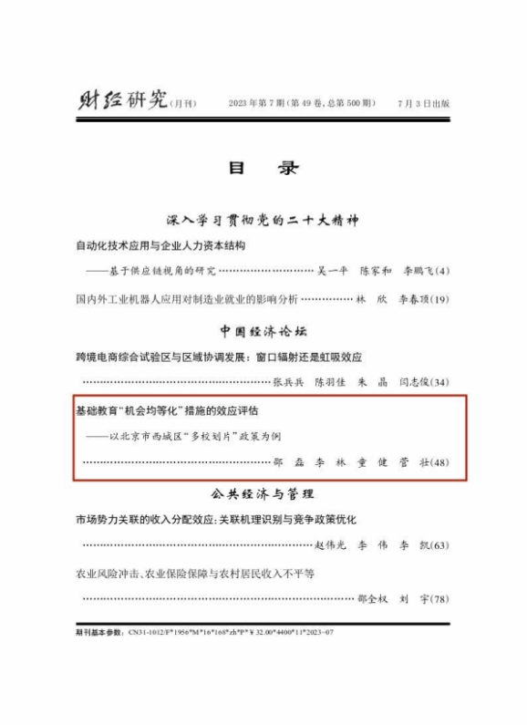 永利yl23455副教授邵磊、博士研究生李林、讲师童健与中国石油物资有限公司员工菅壮合作撰写的论文《基础教育“机会均等化”措施的效应评估——以北京市西城区“多校划片”政策为例》刊发于中文A类期刊《财经研究》2023年第7期。以下为文章主要内容: