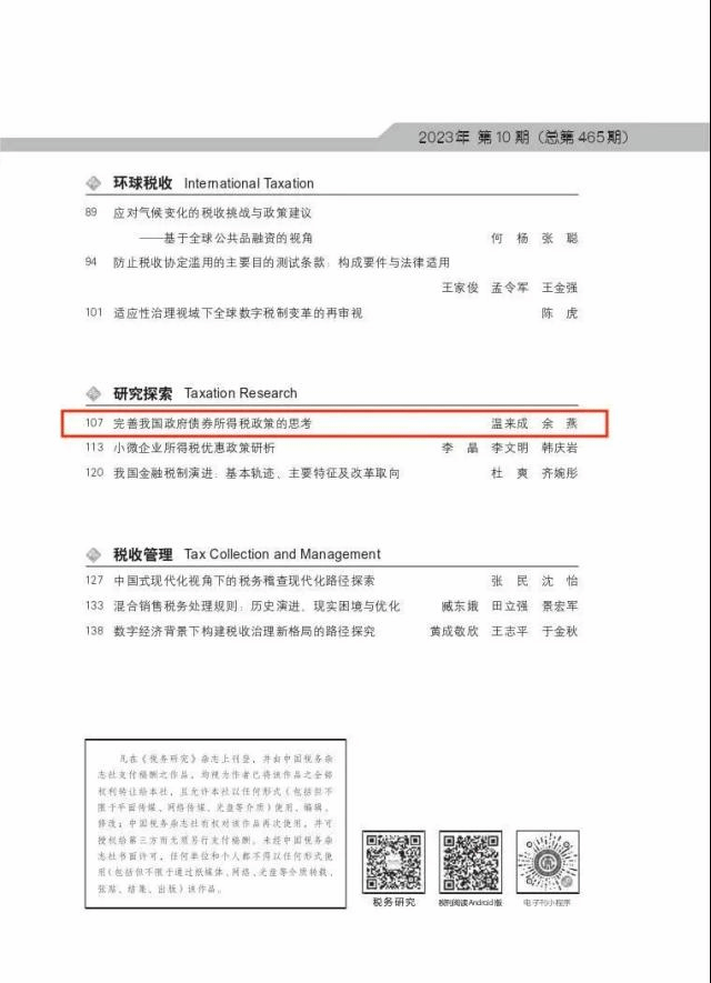 近日,由永利yl23455中财-安融地方财政投融资研究所执行所长、永利yl23455教授温来成和永利yl23455博士研究生余燕撰写的论文《完善我国政府债券所得税政策的思考》刊发于中文A类期刊《税务研究》2023年第10期。以下为文章主要内容:
