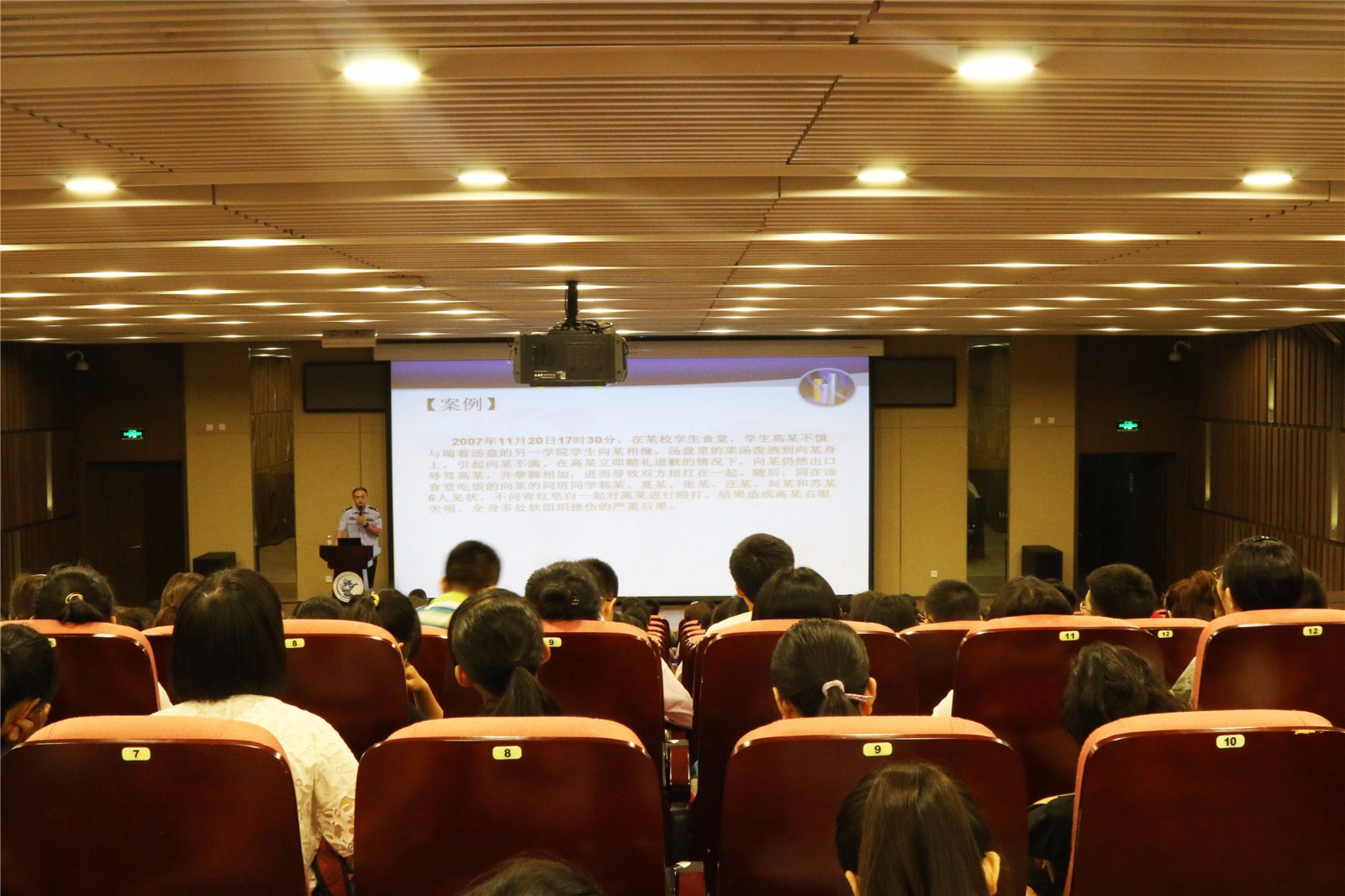 接着,常警官列举了盗窃、打架斗殴等校园内易发生的违法犯罪行为,并细介绍了正确的防范防卫措施。他提醒同学们,要加强自身的法律观念,提升思想道德修养,正确化解矛盾纠纷;并以交通大学员工自杀致使路人死亡的事件为例,告诫同学们务必尊重自己和他人的生命安全。