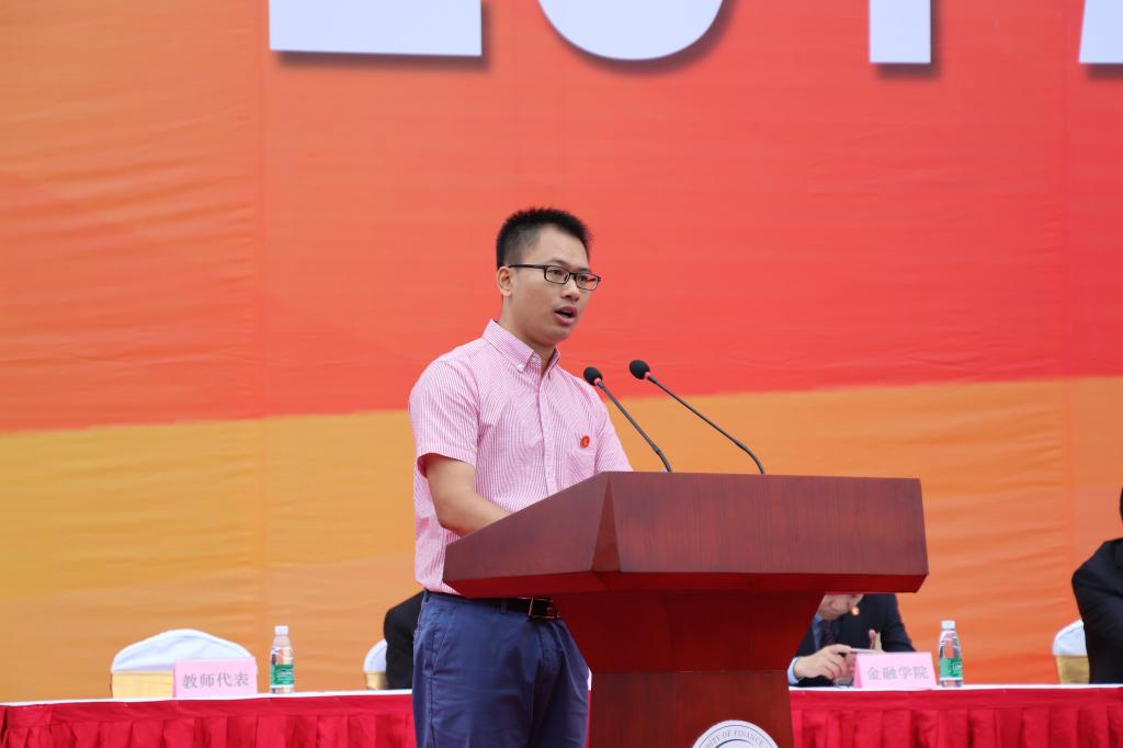 随后,由教师代表陈运森副教授进行发言。陈教授结合热会热点事件与亲身经历,突出“遥远的未来已经到来,变化已经开始”主题。并且针对“如何能够恒无止境持续进步”的问题展开对同学们如何为人,如何为事和如何为学的殷殷教导。他提出,同学们要谦卑不自我,谨慎不张扬,并且培养同理心。同时要学会接纳不好的人事,从容地拥抱失败。最后要追求长期能够提升个人认知,道德观的知识,并且做到批判性学习,思考性学习,深度学习。