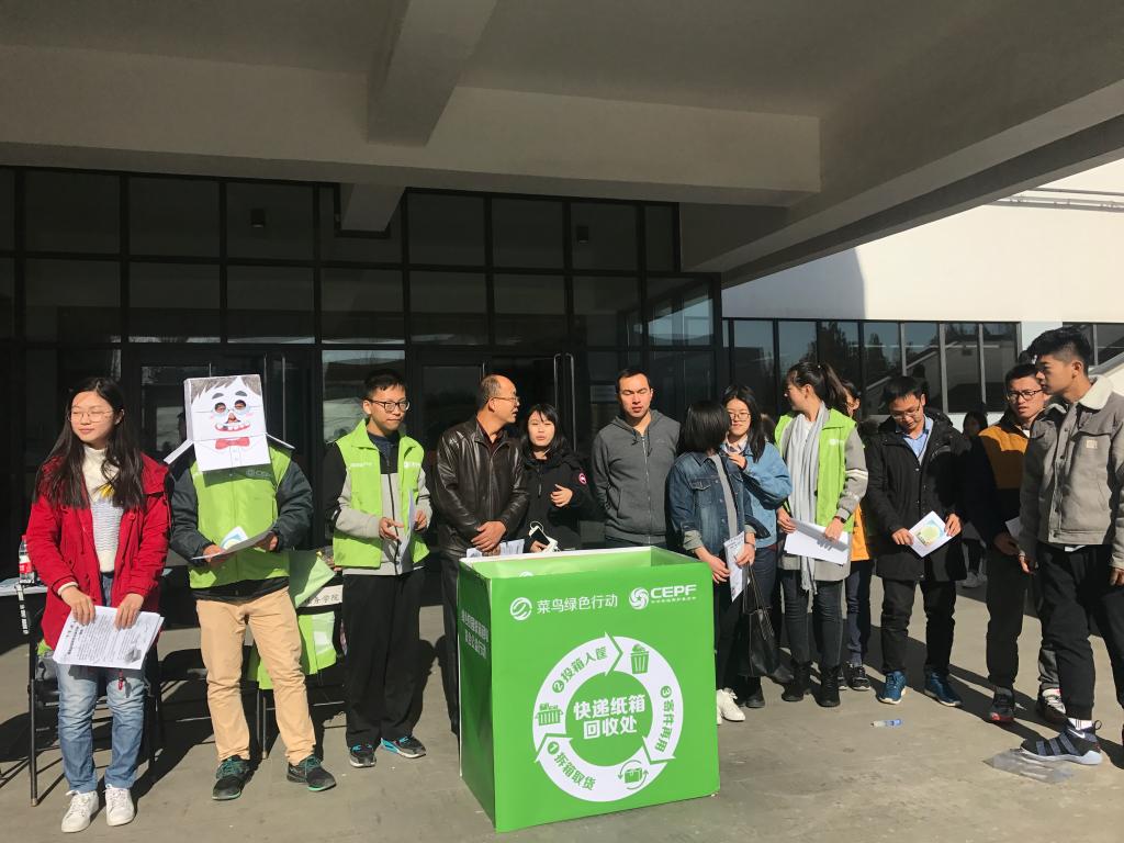 与此同时,一部分志愿者前往西门元创易站旁进行活动宣传与纸箱收集。由于“双十一”期间网购数量较多,前来取快递的同学也络绎不绝,同学们在看到收集纸箱的志愿者们后,都十分愿意将收到的的快递的包装箱捐赠出来,为环保做一份贡献。