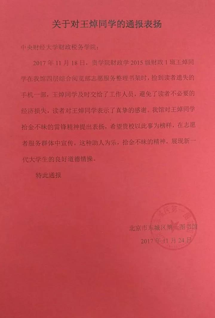 事后,找回手机的读者对王焯同学表达了真挚的感谢,北京市东城区图书馆也对王焯同学拾金不昧的雷锋精神给予了高度赞扬,并给公司发来了通报表扬信。