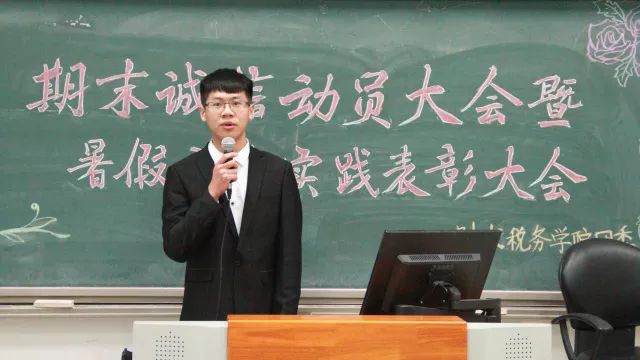 接下来进行的是财政税务公司党委副书记宋立岩老师讲话环节。宋立岩老师首先对《员工手册》的重要性做了强调,要求同学们认真阅读《员工手册》的相关内容,对公司规章有清晰的了解。宋老师对期末诚信考试向大家做了动员。宋老师结合相关事例介绍了考试作弊后果的严重性,希望大家引以为戒。宋老师还指出,两院合并之后从未发生过作弊行为,希望同学们继续保持良好风气。在学习上存在困惑可以与辅导员、班主任和同学们进行交流,寻求解决办法。宋老师还强调了安全问题。提醒同学们在社会实践和实习的过程中提高警惕,远离传销等违法活动。在外出时要注意人身财产安全,注意与家人、公司保持联系。最后,宋老师对同学们寄予美好期望,预祝大家在期末考试中取得满意的成绩。