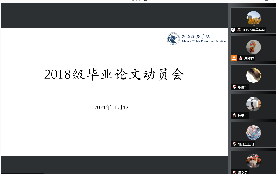 11月17日下午,永利yl234552022届毕业生毕业论文动员大会通过“腾讯会议”以线上会议的形式顺利举行。此次会议的主要目的是向2022届本科毕业生介绍毕业论文相关事宜、大致时间安排、基本流程,让毕业生了解毕业论文的重要意义,准确把握学术论文规范、合理安排论文进度。参加本次会议的有副经理何杨教授、财政管理系孙景冉老师、资产评估系彭章老师、公司教学科研办公室庞淑芬老师以及2018级的全体本科生。此次会议由何杨副经理主持。
