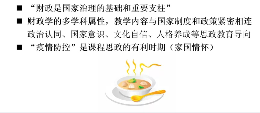 我发言的题目是《<财政学>课程思政的几点思考》。我想从三个方面来展开:一是课程思政对财政学人才培养的重要性,二是财政学类课程有着思政的天然优势,三是《财政学》中融入课程思政元素的探索。
