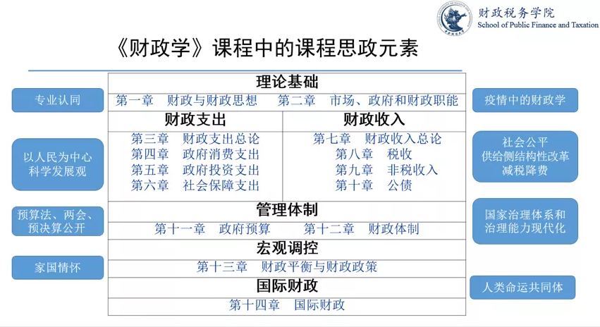 “财政是国家治理的基础和重要支柱”,所以在财政学类的课程中,我们天然地就会把经济的、政治的、文化等等这种多学科属性呈现给同学,而我们的教学内容也大多跟国家的制度还有政策是紧密相连的,教师就可以把政治认同、国家意识、文化自信还有人格养成这些融入到专业课授课过程中。